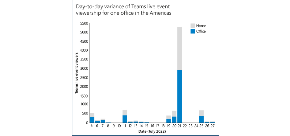 For most days in July, fewer than 100 employees at one of the firm’s US offices consumed video on-site. However, on six separate days in the month, several hundred employees streamed live events in the office – on one day on-site viewers reached nearly 3,000.