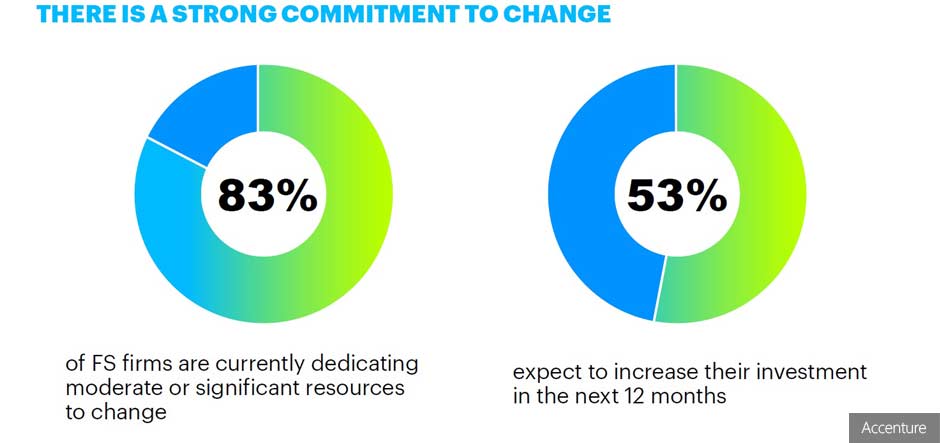 A new Accenture survey found that 53% of nearly 800 banking and insurance executives expect to invest more heavily in change programmes over the next year, primarily due to cost pressures, new regulations, increased customer expectations and digital disruption. The remaining 37% said they would maintain their current investment levels.