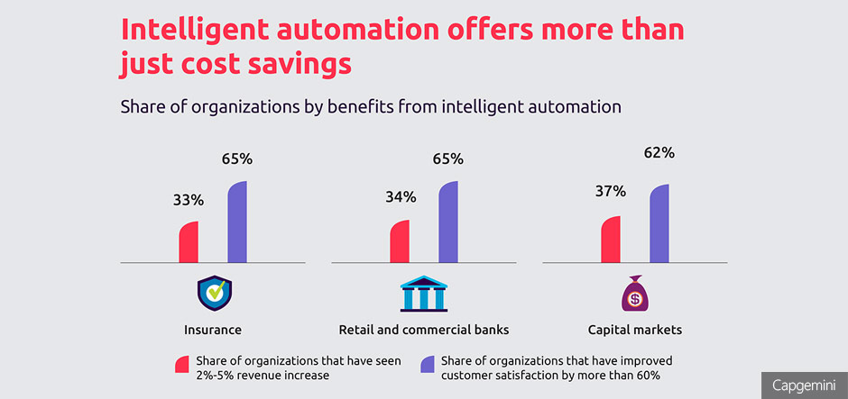 On average, intelligent automation has helped 35% of financial services firms to gain a 2-5% rise in top-line growth, while over two thirds of organisations have witnessed at least a 60% improvement in customer satisfaction. Meanwhile, if a business uses AI-enhanced RPA, then it could achieve a 30-50% increase in cost savings .