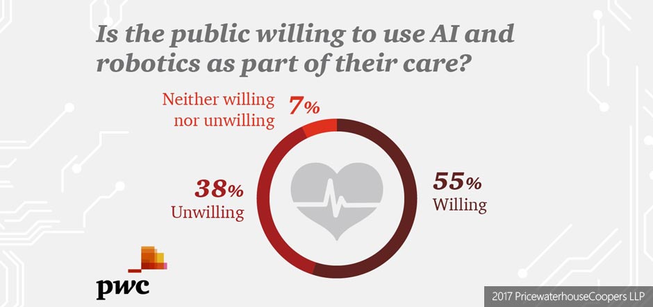 PwC’s What doctor? Why AI and robotics will define New Health report found that around 36% of the 11,000 survey respondents would be willing to use an AI-enabled or robotic health procedure or service if it gave them quicker or easier access to healthcare services. Similarly, 33% said the speed and accuracy of diagnoses would be primary motivators for them to use the new technologies.