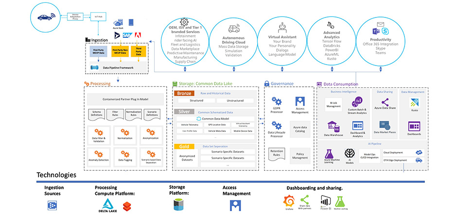 Another consideration is when this takes place, and at what level of completeness. In the field of data analysis, practitioners often talk of ‘hot’, ‘warm’, and ‘cold’ path analytics. The degree of ‘heat’ here indicates the lag time, or ‘latency’ between the event being monitored and information extracted, with ‘hot’ being the nearest to real-time, and cold being typically based on an aggregation of broader historic data. A solution that supports such paths is said to have a Lambda architecture – Microsoft solutions for connected vehicles provide such an approach. The ‘hottest’ analysis might well take place in the vehicle, and ‘edge’ technologies such as Microsoft’s Automotive Intelligent Edge are an effective way of rapidly developing and deploying such solutions with a dynamic continuous integration/continuous delivery pipeline while still meeting the requirements of in-vehicle environments.