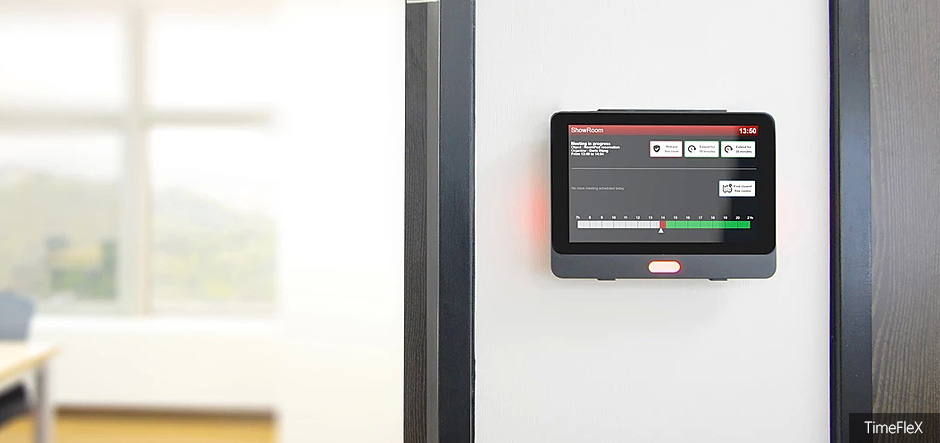 The new TimeFleX NFC door panels can be placed outside meeting rooms to display relevant information about room occupation, seating, upcoming events, required catering services and much more.